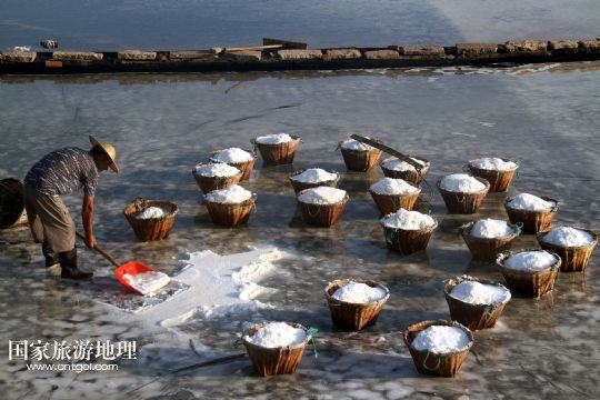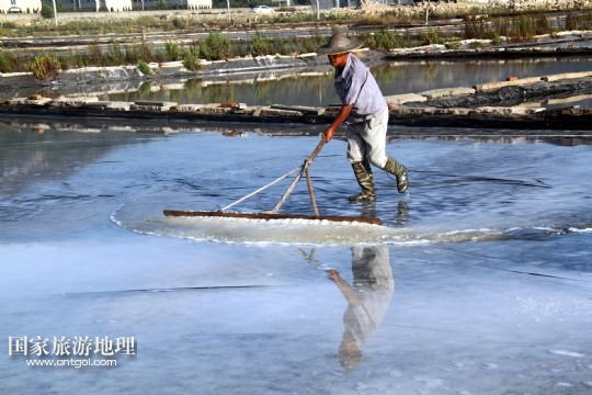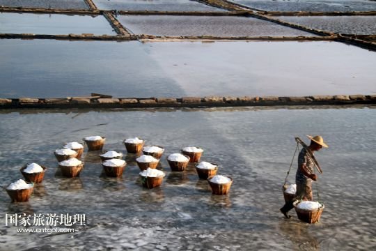 國家旅游地理 浙江臺州8月10日訊 8月10日,在浙江溫嶺市石塘鎮(zhèn)蒼岙鹽場,一名鹽工頂著太陽在鹽田里把曬好的鹽收集起來挑到鹽堆去。連日來,浙江省溫嶺市石塘鎮(zhèn)蒼岙鹽場的鹽工利用晴熱天氣忙著曬鹽。對于浙江的曬鹽人來說,夏季陽光最猛烈的7月、8月、9月這三個(gè)月是他們勞作的黃金季節(jié)。天氣越炎熱,光照越猛烈,曬鹽效果就越好。炎熱的夏天艷陽高照,而曬鹽人卻要頂著高溫出門勞作。 /新華社發(fā)(梁敏慧 攝)