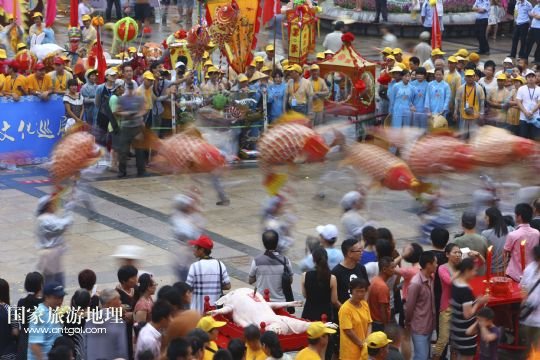 國(guó)家旅游地理 浙江寧波9月14日訊 9月14日,在浙江省寧波市象山縣,當(dāng)?shù)貪O民在進(jìn)行漁區(qū)民俗文化表演。當(dāng)日,浙江寧波象山縣舉行漁區(qū)民俗文化巡展,魚(yú)燈、馬燈、百獸燈、船燈等13支表演隊(duì)為游客奉獻(xiàn)了精彩的民俗表演,展現(xiàn)了象山燦爛的民俗文化和獨(dú)特的海洋風(fēng)情。 /新華社發(fā)(張培堅(jiān) 攝)