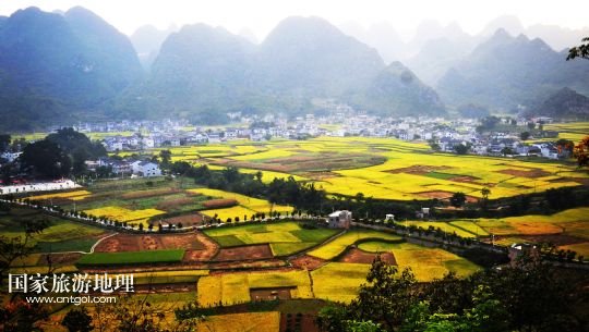 金秋時(shí)節(jié),貴州省興義市山鄉(xiāng)里金黃的稻田與民居交相輝映,秋景如畫。