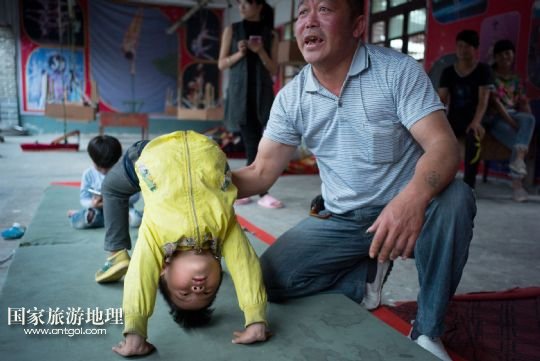 國家旅游地理 安徽阜陽5月31日訊 安徽省潁上縣三王村鄉(xiāng)村雜技學校成立于2007年。每年都有百余名農村孩子來到這里學習雜技。