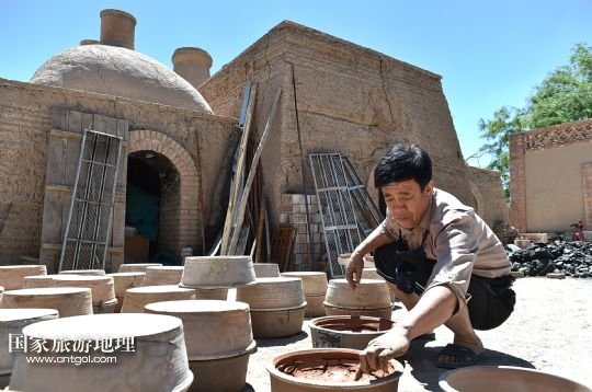 國(guó)家旅游地理 寧夏銀川6月12日訊 6月11日,李五奎在銀川西夏風(fēng)情園陶藝館制作陶罐。今年51歲的陶藝師李五奎和泥巴打了一輩子交道。從他爺爺開始,一家三代人都以制陶為生。李五奎從十幾歲開始便幫著家里制作陶器。