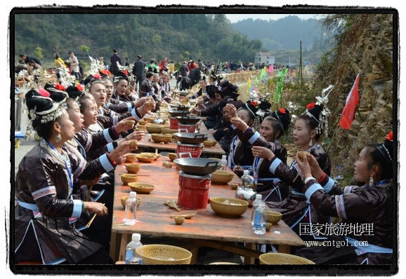 今年黎平侗年節(jié),除了延續(xù)亙古以來(lái)老百姓過(guò)侗年的各項(xiàng)傳統(tǒng)習(xí)俗活動(dòng)外,還有“天下侗家年”大型侗族史詩(shī)情景歌舞展演、侗族萬(wàn)人長(zhǎng)桌宴、招商引資推介會(huì)、七彩田園采摘體驗(yàn)、百村集市商品展銷、侗文化研討會(huì)、楊再思文化交流研討會(huì)等多項(xiàng)主題活動(dòng),其中,主打主推的“最大合攏宴”(萬(wàn)人長(zhǎng)桌宴)品牌,得到基尼斯紀(jì)錄總部到現(xiàn)場(chǎng)認(rèn)定,以1700桌合攏宴,總長(zhǎng)3.7公里,10380人同桌就餐,創(chuàng)歷史之最,成功載入《基尼斯紀(jì)錄大全》,吸引數(shù)萬(wàn)旅游客到場(chǎng)親自見(jiàn)證、參與、感受和體驗(yàn)這一千載難逢,氣勢(shì)恢宏的盛況。